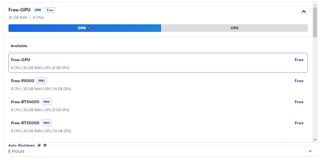 Next, choose a GPU instance to create the notebook (or CPU depending on the project), for example the RTX5000 option, and an automatic shutdown of 6 hours.