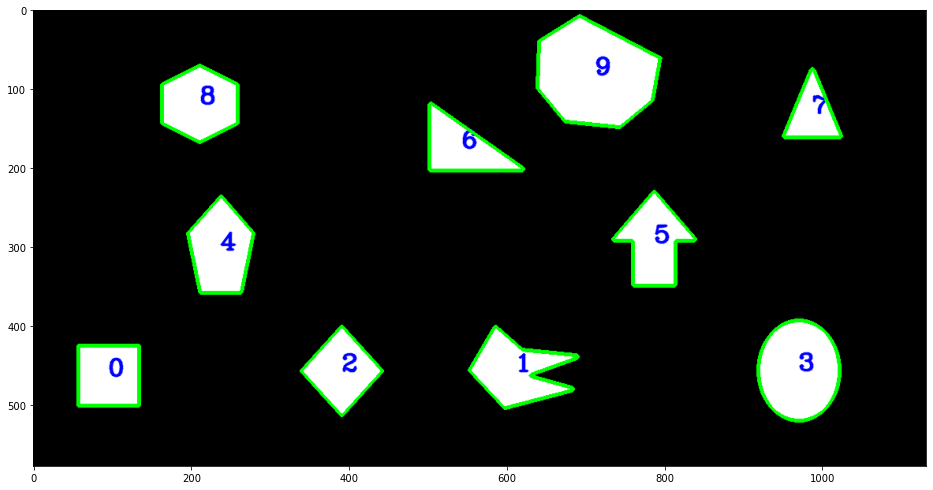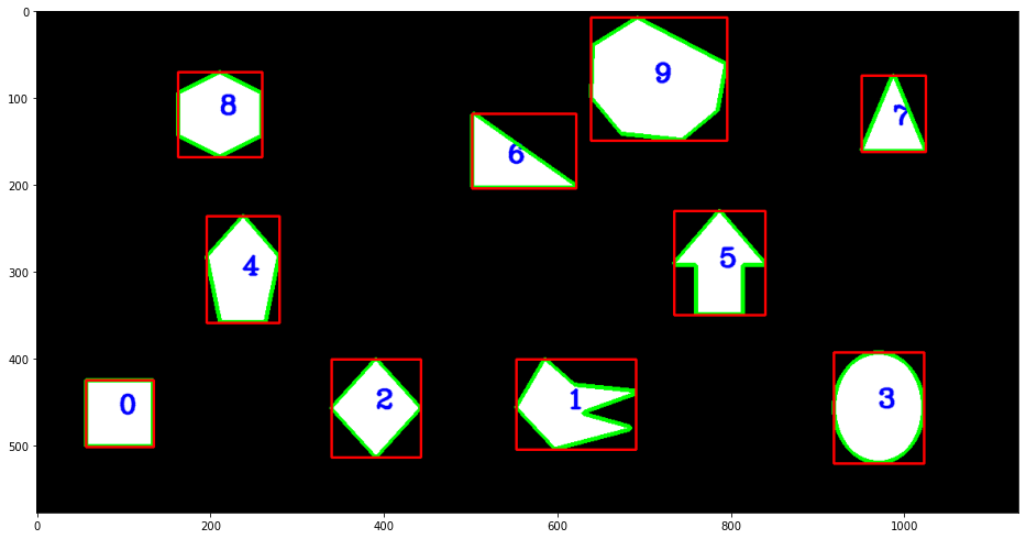 Label the contours so we can refer to them later. The first method we’ll use below is contourArea to filter out noise. We’ll also use moments to calculate the contours centroid.